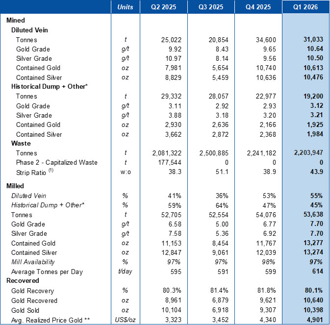 - 50,233 tonnes mined, containing 12,538 ounces (“oz”) of gold (“Au”) at an average grade of 7.76 grams per tonne (“g/t”) Au and 12,460 oz of silver (“Ag”) at 7.71 g/t Ag