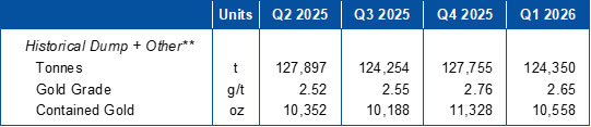 - 19,200 tonnes mined from historical dump and other mineralized material above cutoff grade (“historical dump + other”) containing 1,925 oz Au at 3.12 g/t Au and 1,984 oz Ag at 3.21 g/t Ag